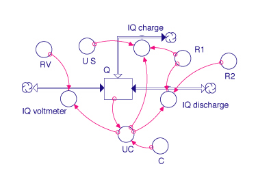 | | Laws of balance dQ(t)/dt = IQ_charge - IQ_voltmeter - IQ_discharge INIT Q = C*UC_init Flows IQ_charge = IF (TIME < 10) THEN 0 ELSE IF (TIME < 80) THEN -(UC-U_S)/R1 ELSE 0 IQ_discharge = IF (TIME < 400) THEN 0 ELSE UC/(R1+R2) IQ_voltmeter = UC/RV Relations UC = Q/C Parameters C = 470e-6 R1 = 9.88e3 R2 = 97.9e3 RV = 1e6 U_S = IF (TIME < 10) THEN 0 ELSE IF (TIME < 80) THEN 3.00 ELSE 0 UC_init = 0 |