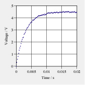 A capacitor is hooked up to a (real) battery and a resistor. The circuit is closed and the capacitor charges (see the voltage across the capacitor as a function of time in the diagram). System parameters are to be determined with the help of a dynamical model. Resistance of the resistor, capacitance, and open circuit voltage and internal resistance of the battery are all unknown. a. Determine the capacitive time constant of the circuit from the experimental data. b. Use the data to determine the open circuit voltage of the battery. (Why is it possible to get this parameter directly from the data?) c. Sketch the diagram of a system dynamics model of the circuit. Identify all necessary parameters. d. Write all the equations of the model. Introduce the constitutive laws in the single differential equation to transform it into a DE with U_C(t) as the unknown function. Show that U_C(t) = U_Bo·(1 exp(t/(RC))) is the solution of this equation. U_Bo is the open circuit voltage of the battery. e. What is the meaning of R in the solution in d? f. It turns out that we do not have enough data to fix the missing parameters. Why is it that any combination of R and C (where the product of R·C must always be the same) leads to a perfect fit of model and data? | | g. If you choose C = 200 µF, what would be the appropriate value of R? What would it be for C = 400 µF? Considering that the model correctly predicts U_C(t), is there anything different in the experiment for these two situations? h. Describe additional experiments to determine the missing parameters uniquely. |