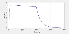 A single capacitor is charged and discharged. Charging takes place btween t = 10 s and 80 s in a circuit having a battery and a resistor. At t = 80 s, the charging circuit is opened. At t = 400 s, a second connected circuit with the capacitor and two resistors in series is closed, and discharging sets in. During the entire process of charging and discharging, a voltage probe is conneted to the capacitor to measure U_C(t). The voltage probe has a high internal resistance of some MOhm. Data of the voltage across the capacitor is shown in the diagram below. a. Draw a circuit diagram that corresponds to this experiment, and describe the experiment in you own words. b. The resistance of the resistor in the charging circuit is 9.88 kOhm. Use the enlarged section of the graph (Click for pdf and print) to determine the time constant of charging. Do this directly from the graph, and again by creating a logarithmic representation of data. c. Use the determination of the time constant to find the capacitance of the capacitor. d. From t = 80 s to t = 400 s, the measured voltage decreases slowly. Use this to calculate the resistance of the voltage probe. Taking the effect of the voltage probe into account, do you have to change the determination of the capacitance of the capacitor (Problem c)? e. What is the voltage set up by the battery? Why is it higher than the 4.61 V reached by the capacitor shortly before t = 80 s? | | f. Use data on discharging to calculate the total resistance of the resistors in the circuit used for discharging. What is the role of the volmeter during this phase? g. Sketch the diagram of a system dynamics model that can be used to represent the system and its processes discussed here. |