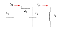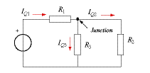 We need to find the objects that store electric charge and then identify all the transports of charge with respect to them. This leads to expressions for the balance of charge for every such object. In a circuit having two capacitors as in Figure 1, there are two storage elements. There is a single current with respect to the first. On the other hand, there are two currents leading into or out of the second capacitor. One of the currents is equal to the one leading into or out of the first capacitor. In system dynamics diagrams, laws of balance in their instantaneous forms can be represented graphically by combinations of storage and flow symbols (Figure 2). For each of the subsystems and for each of the stored quantities, a law of balance is formulated (normally in dynamical or instantaneous form). A law of balance relates all processes to how fast the system content changes: This is the form of the laws of balance applicable to the system of Figure 1. Many applications in electricity use circuits that do not have real storage elements leading to dynamical processes. Figure 3 shows the diagram of a circuit that leads to steady-state processes. Charge is not stored anywhere. However, there still is an element for which a law of balance of charge has to be expressed. This is the junction in Figure 3 for which we write the junction-rule (Kirchhoff’s first law): |  Figure 1  Figure 2  Figure 3 |
