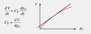 | | CAPACITANCE (HYDRAULIC) | | Description | The hydraulic capacitance (also called the compliance) tells us how hard it is to change the pressure of a fluid stored by adding more of the fluid to the tank. It is the factor relating the rate of change of volume to the rate of change of capacitive pressure (difference). It is equal to the inverse of the elastance. | | Symbols | C_V | | Relations |  | | Units | [C_V] = m^3/Pa | | Synonyms | compliance | | Related to | | | Remarks | For a range with constant capacitance, C_V = const., we have ∆V = C_V·∆p_C If the pressure of the fluid is the result of gravity, the hydraulic capacitance of the container depends upon the cross section of the tank: C_V = A(h)/(rho·g) | | German | hydraulische Kapazität | | |  | | |