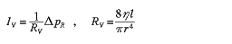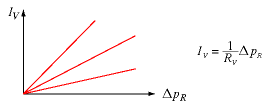 | | HYDRAULIC RESISTANCE | | Description | The hydraulic resistance (or simply flow resistance) is the inverse of the hydraulic conductance: R_V = 1/G_V. | | Symbols | R_V | | Relations |  The characteristic line with the larger slope has the smaller value of the resistance. | | Units | [R_V] = Pa·s/m^3 | | Synonyms | flow resistance | | Related to | | | Remarks | In the case of laminar flow through circular pipes, the hydraulic resistance is calculated according to the law of Hagen and Poiseuille:  delta_pR: resistive pressure difference, r: radius or pipe, eta: viscosity of fluid, l: length of pipe. | | German | hydraulischer Widerstand | | |  | | |
