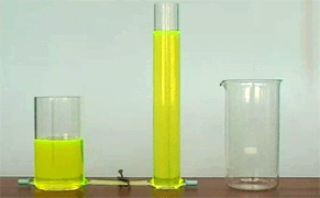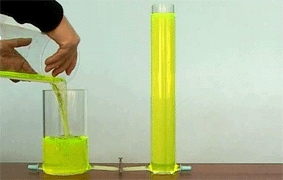 Two cylindrical tanks are connected by a hose at the bottom. Water in one of the tanks flows into the second tank. Levels in both tanks are measured as functions of time. When the water is allowed to flow, it flows from the tank with the higher level to the one with the lower level. The levels change quickly at the beginning and more slowly later on. When the levesl have become equal, the flow of water stops.