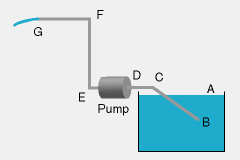 Water is pumped through a system of pipes all of which have the same diameter. The water is taken from a tank at some depth, and it is transported and pumped to a point high above the water in the tank.