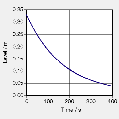 The oil level is shown as a function of time in the graph on the right. The diameter of the tank is 20.0 cm. The length of the pipe is 1.055 m, its radius is 8.1 mm. The density of rape seed oil is 910 kg/m^3. Data found in Single_Tank_Oil.